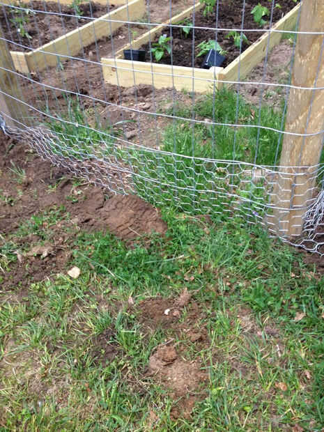 Corte el cerca de 4 pies de alto por la mitad y luego la había doblada en el medio, cavé lejos por la base y hace forma de L enterrado una parte debajo de la tierra y el otro conectado a la esgrima, veremos cómo smart es la marmota.