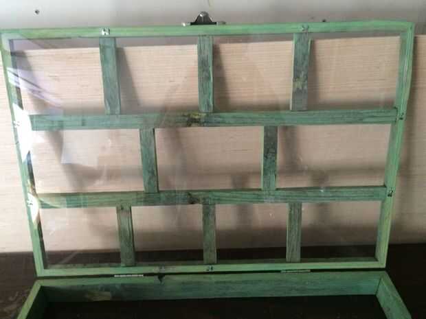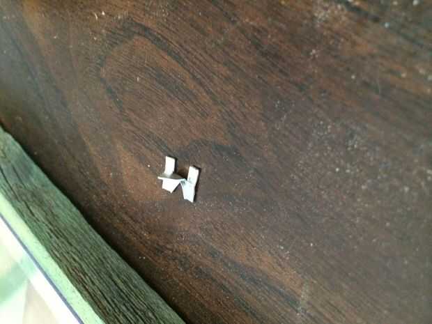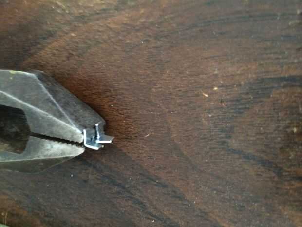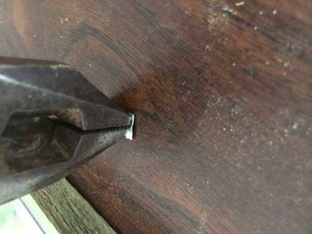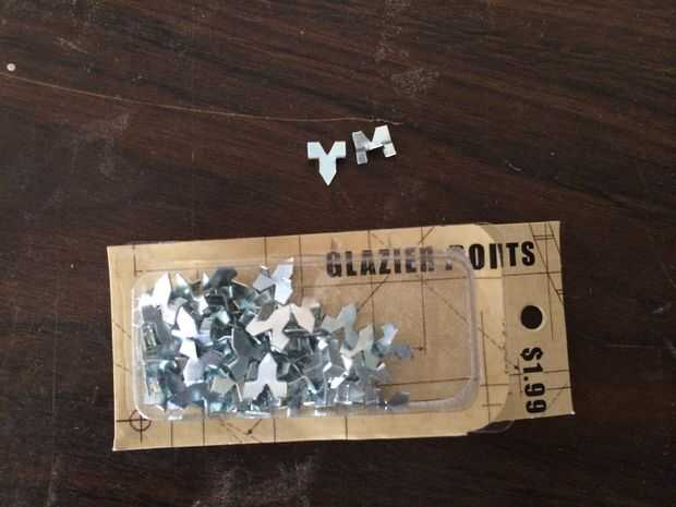 Me corte el vidrio para encajar unos ¼" dentro del marco exterior de la tapa y había anclado abajo con tachuela modificada de vidriero. Para modificar el rumbo usé pinzas para agarrar el extremo del punto y presione el extremo cuadrado (enfrente del punto) sobre una mesa para hacer una "T" (con la punta hacia abajo). Con la nueva forma de "T" puedo presionar el punto a la madera y tener una superficie completamente plana contra el vidrio.