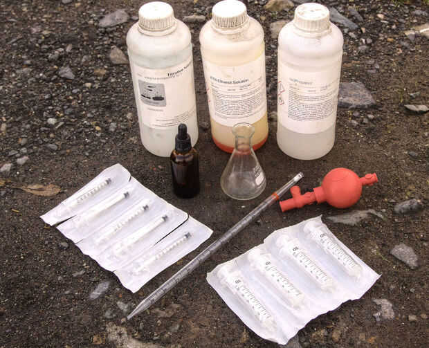 Añadir 1ml de aceite en el frasco y luego 10ml de Isopropanol con las jeringas y después 3 gotas de la solución indicadora. Mientras revuelve la solución agregar el hidróxido de sodio una gota a la vez utilizando la pipeta hasta la solución del indicador cambia de amarillo a verde. Seguir añadiendo las gotas hasta que el color verde se mantiene durante al menos 15 segundos. La cantidad de hidróxido utilizado será la lectura final menos la inicial lectura, en ml.