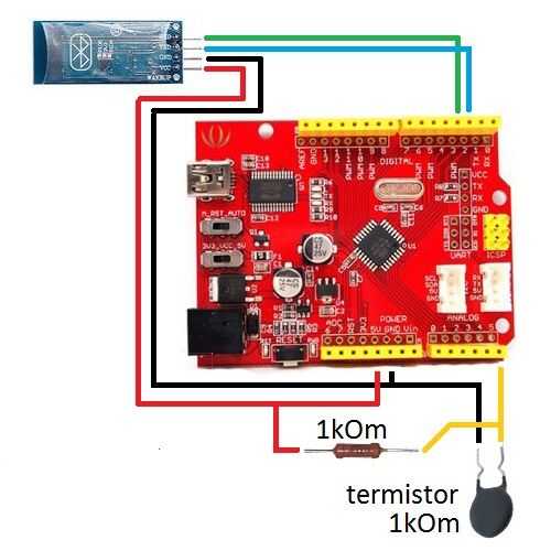 Para la fabricación de la parte eléctrica del dispositivo, necesita cualquier placa Arduino, el termistor 1K, resistencia de 1K. Por encima de la imagen es un diagrama de las conexiones de todos los elementos estructurales. El circuito termistor está incluido en el divisor de tensión, un hombro en el segundo que es de resistencia constante. El punto medio del divisor de voltaje tenemos conectado a una entrada analógica de Arduino con el número A5.