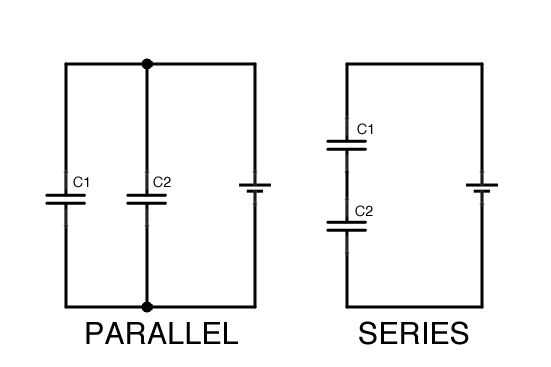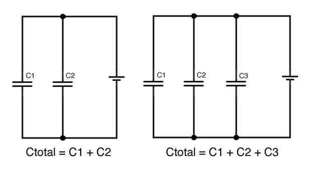 Capacitancia se añade en paralelo, esto significa que la capacidad total de un conjunto de condensadores en paralelo es igual a la suma de todos los condensadores que contribuye. Las imágenes de arriba muestran cómo conectar condensadores en paralelo. Cuando dos condensadores, C1 y C2 están cableados en paralelo, su capacitancia combinada es igual a C1 + C2. Este principio se aplica a los condensadores de más de dos, tres condensadores en paralelo, C1 C2 y C3, con una capacidad combinada de C1 + C2 + C3.