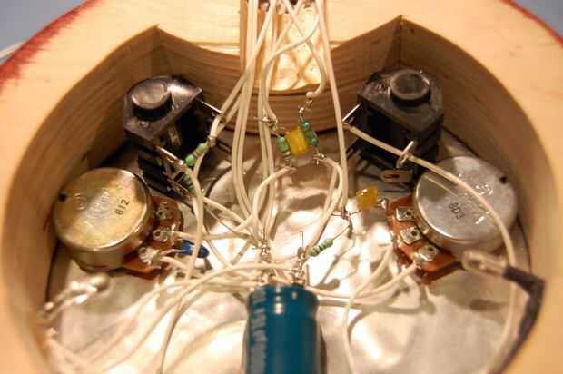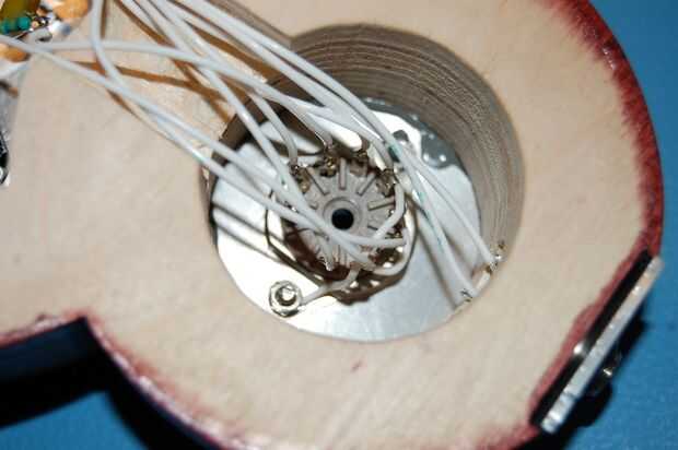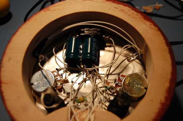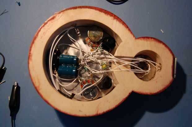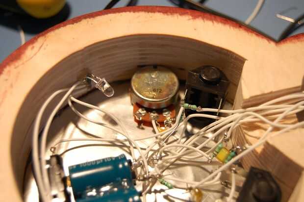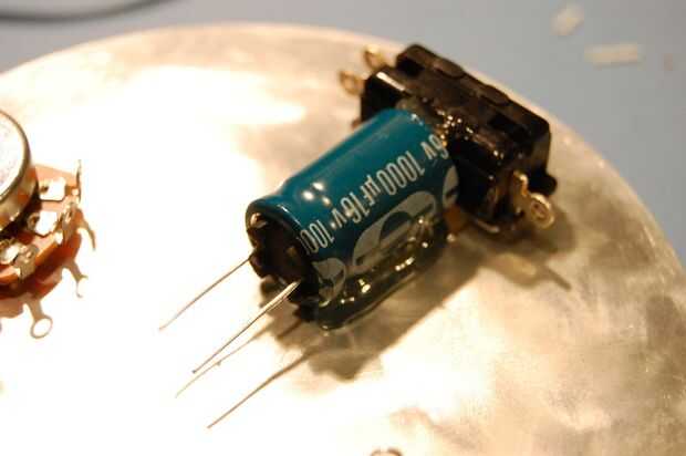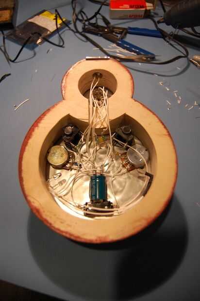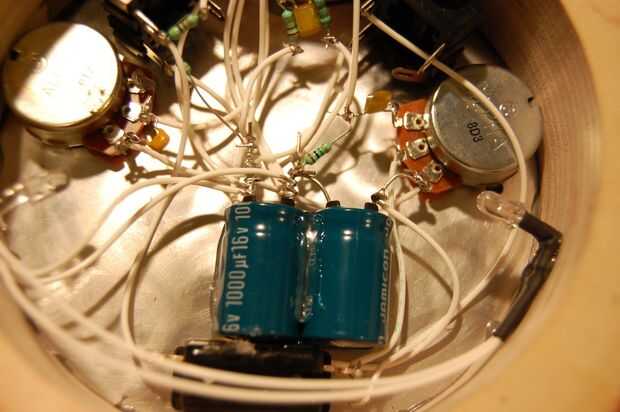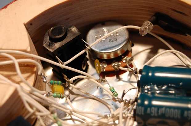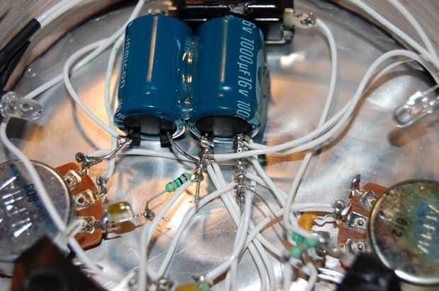 Además el esquema original, he añadido algunas piezas de mi propia. Soldado dos condensadores 1000uF de energía a tierra, para ayudar a la fuente de alimentación del filtro. También he añadido dos LED azul brillante con resistencias de limitación actuales. Los LED de hacer que la caja se ilumine desde la parte inferior.