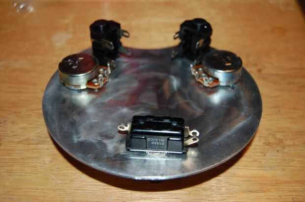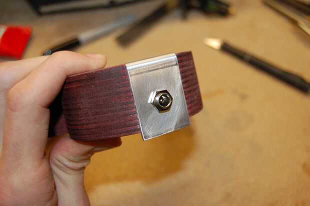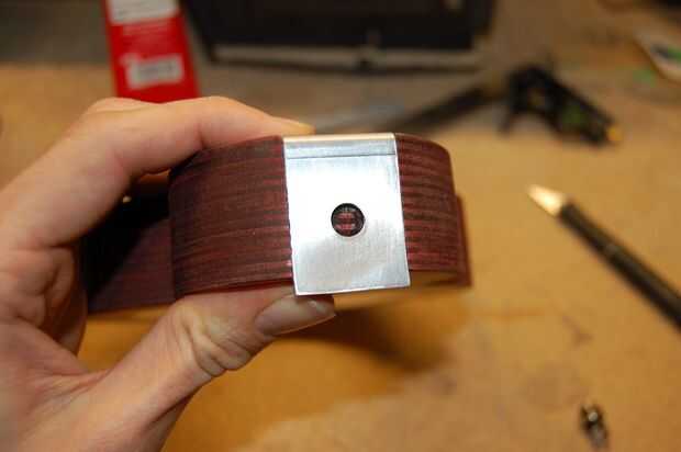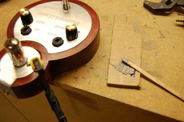Aplique el pegamento en la sección de fresado de la estructura de madera y pegar abajo de la placa metálica. Antes de pegarse a la placa de la válvula, inserte al conector de válvula toma de corriente y potencia con los alambres previamente soldados a las patillas. De lo contrario será muy difícil ponerlos en después.