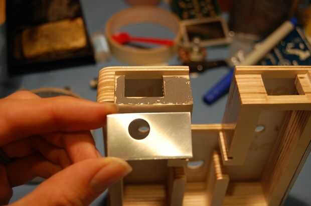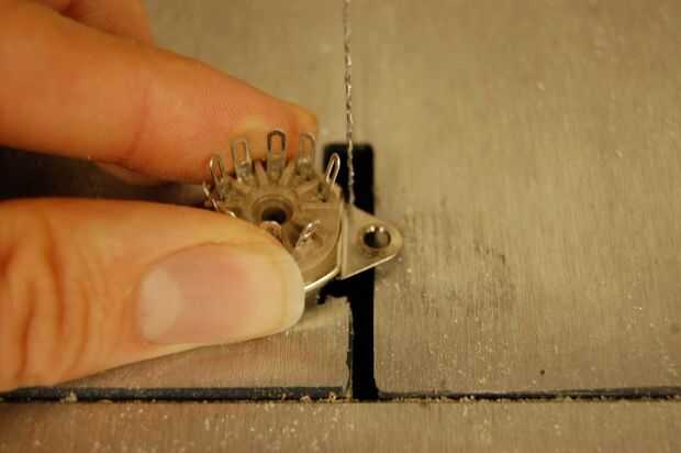 La placa sostiene la toma es un poco diferente - no encolarla con el resto. Empezar por modificar la toma de cortar las aletas del tornillo. He utilizado una sierra de banda, pero una dremel o doblar que ellos pueden funcionar igual de bien. El zócalo a su placa con JB Weld o del pegamento. Cuando el pegamento esté seco, soldar los cables en las fichas de toma de corriente como se muestra en el paso de cableado y componentes varios. Una vez que ha hecho te puede volver y el zócalo y la placa en el lugar en el marco del pegamento.