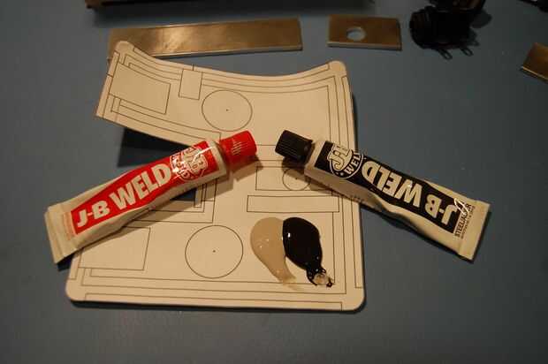Mezclar el JB Weld y aplique una capa fina a cada una de las chapas. Palo abajo y sosténgalo por unos minutos. Asegúrese de que las placas de grabado al agua fuerte hacia la dirección correcta! Limpie inmediatamente cualquier squeeze-out que impacto ajuste o final del pedal más tarde.