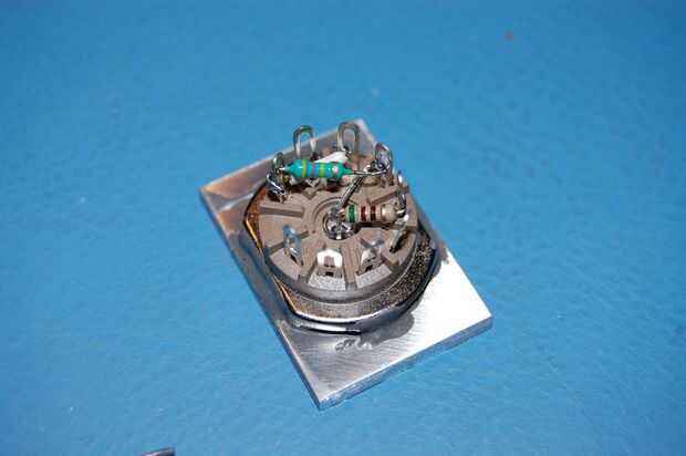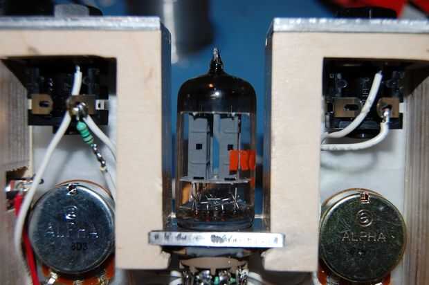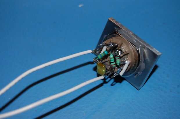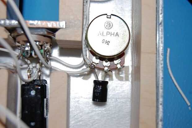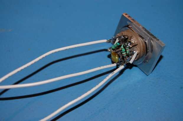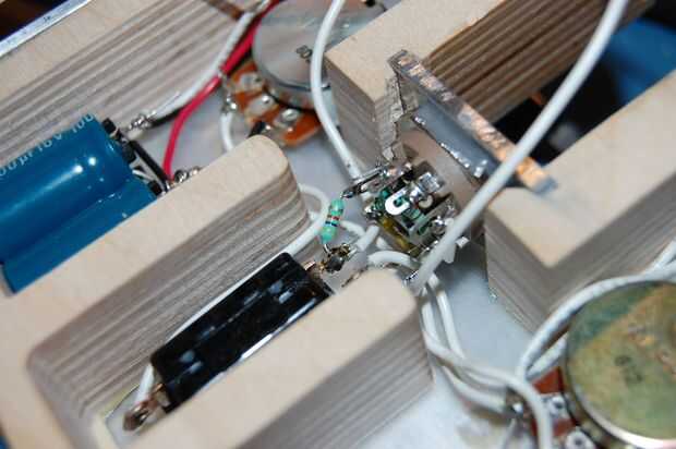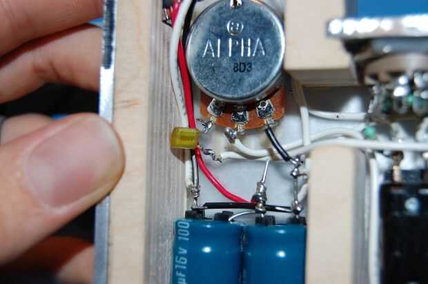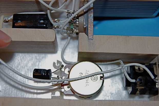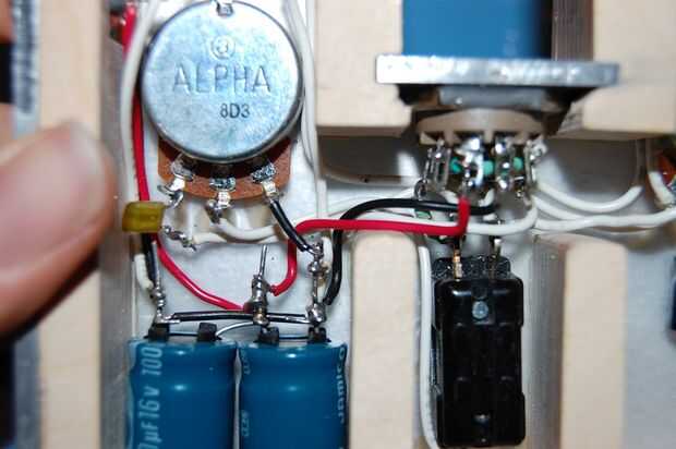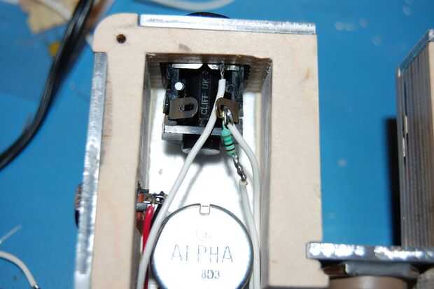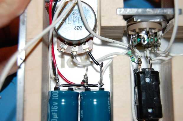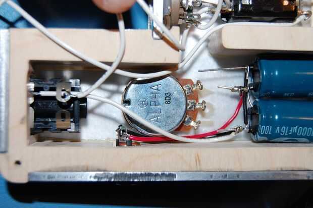 A partir de ahí, proceder de acuerdo con el esquema, pasar los cables tan cuidadosamente como sea posible a sus destinos respectivos. Los pocos componentes que todavía hay que agregar pueden ser soldados directamente a los pines del potenciómetro o 1/4" jack pines, en caso necesario. No te olvides pase los cables de los pines 4 y 5 (V + y GND) del zócalo con los pernos de los condensadores de filtro.