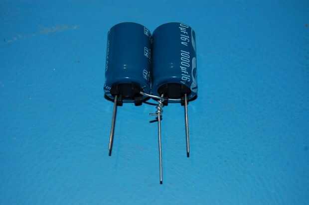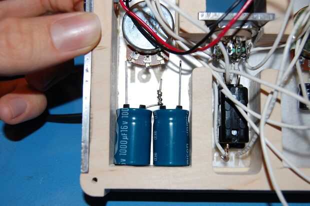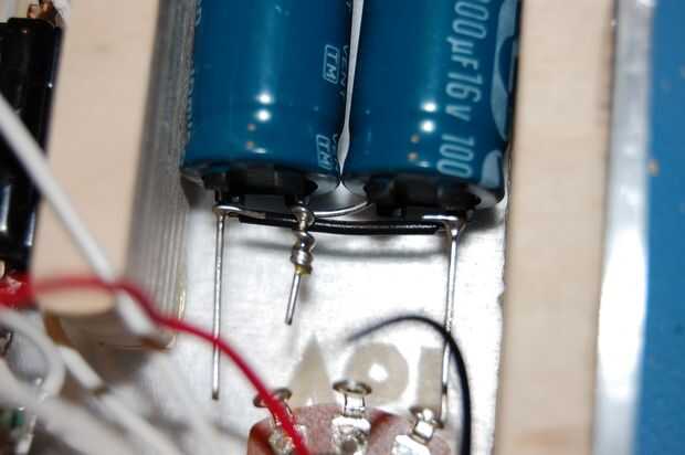 A continuación son los condensadores de filtro grande. Las que usé (1000uF, 25V) pasó a encajar perfectamente en el espacio en un lado del interruptor. Trence los cables positivo y soldarlos juntos. Conecte los cables de dos tierra junto con un pedazo corto de alambre aislado. Entonces, pegamento caliente las tapas en el espacio. Ejecutar los cables de la toma de corriente a los capacitores, se conecta el cable negativo al negativo lleva el condensador y el cable positivo a los cables positivo trenzados en los casquillos.