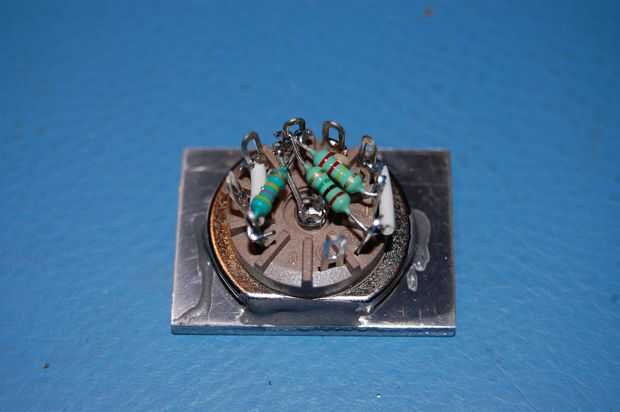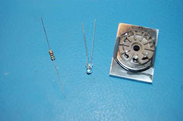 Por sugerencia de un miembro de Instructables en mi otro pedal, el ValveLiTzer Redux, decidió montar un pequeño 3mm ámbar LED en el agujero en el centro de la toma de corriente para iluminar el tubo. Para ello, soldar una resistencia de 510 ohm a uno de los pines de los LED, cerca del cuerpo. Montar el LED en el agujero, luego soldar sus pines directamente a los contactos del zócalo, con el ánodo del LED va a V + (pin 4) y el cátodo del LED (a través del resistor) a tierra (pin 5).