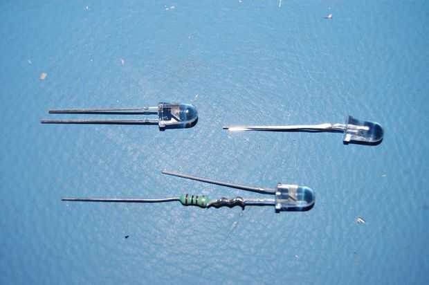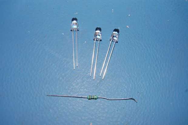 Alambré el LEDs en cadenas de dos series, una con 3 LEDs y los otros dos. Cada cadena tiene una resistencia de limitación de corriente. Usé una resistencia de 120 ohmios para la cadena tres de LED y un resistor de 270 ohm para la cadena dos de LED. Por supuesto podrías añadir más dirigido, pero no hay mucho punto.