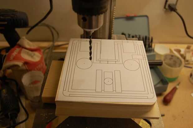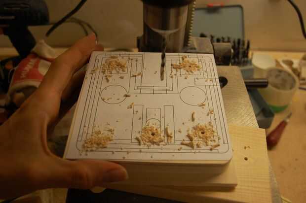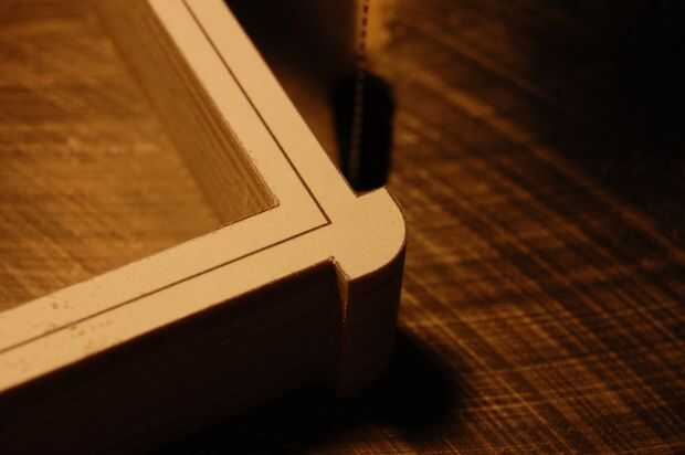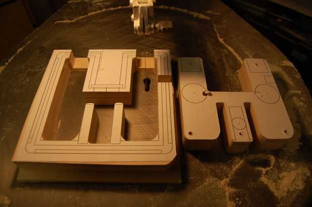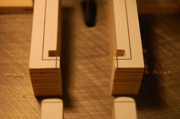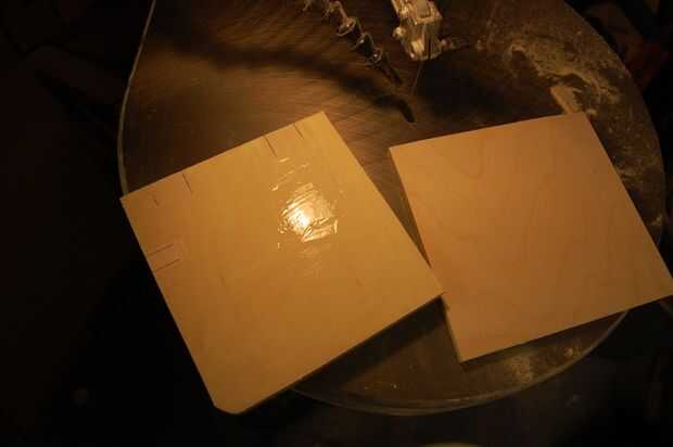 Para facilitar las cosas, el caso principal se corta en dos partes. Comience por cortar los agujeros donde en las salidas y el conector de alimentación irá, desde el 3/4" madera contrachapada. No cortar nada. A continuación, pegar la madera contrachapada de 1/4" hasta la parte inferior de 3/4" pieza, siendo consciente no se cualquier pegamento en los recortes. Fije las piezas Junta no minimizar cualquier costura visible.