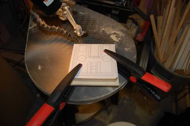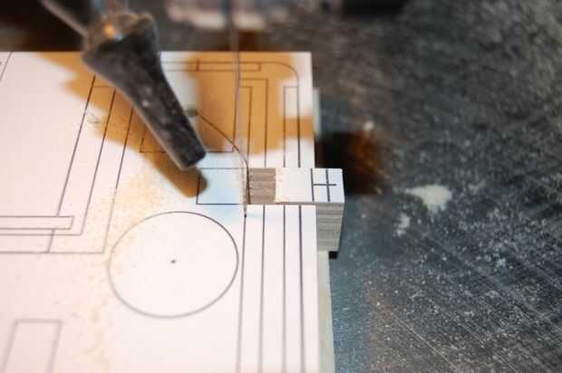 Por último, instalar la cuchilla de punta de corona en la Sierra de calar y girar a la velocidad de 1/4 (posición 3 en el 788 DeWalt). Esto le permitirá cortar el plástico sin lo de fusión. Cortar alrededor del interior muy líneas. La pieza de plástico debe encajar perfectamente dentro del bisel madera. Acabado de la pieza de plástico perforando orificios piloto de 3/32" para el interruptor y dos perillas de ajuste.