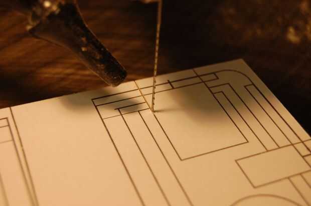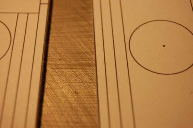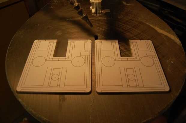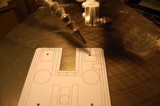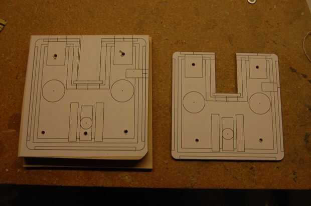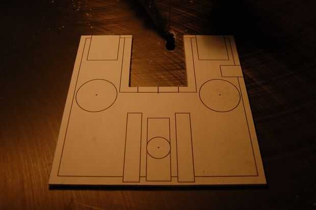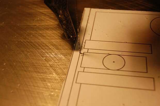 La pieza más fácil que cortar es la base. Simplemente corte alrededor de la línea exterior, ignorando todos lo extra líneas donde van los componentes y las placas de metal.