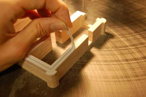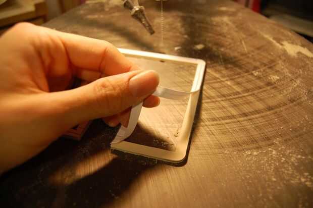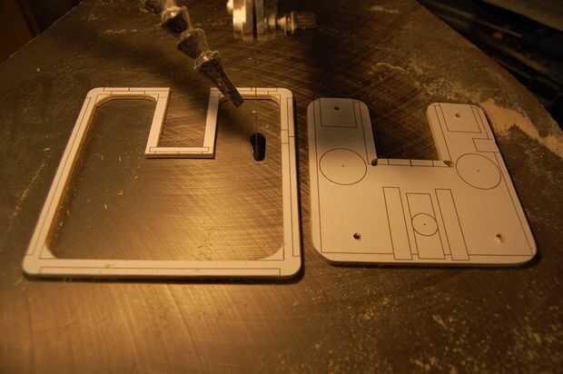 Cuando el pegamento esté seco, taladre un orificio guía para los cortes interiores. Con cuidado corte el interior y fuera de los bordes del bastidor principal. Tome nota de que las piezas de aluminio serán y cortar las muescas para ellos. También ser conscientes de los soportes a cada lado del interruptor.