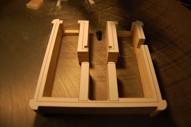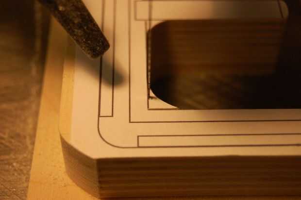 Cortar con cuidado el bisel del panel superior. El exterior primero, luego taladre un orificio guía y hacer el interior corta.