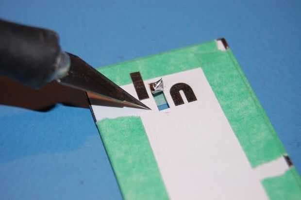 Ahora, aquí viene la parte más difíciles de la construcción. Con una hoja fresca, corte las letras a través del papel y cinta adhesiva hasta el plástico. Tenga cuidado en las esquinas y curvas pequeñas. Con la punta de la cuchilla o un pequeño par de pinzas, Pele el cortar las cartas. Vale la pena realmente, realmente tome su tiempo con esto, porque si atornillar para arriba es muy difícil de arreglar. Suerte y no cometer un error - le animo a hacer lo mismo.