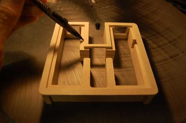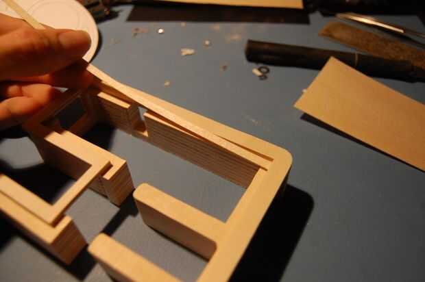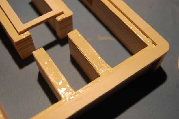 Comenzar pegando el bisel superior en el marco principal de la caja con pegamento de madera. Asegúrese de que las esquinas redondeadas alinean lo más cerca posible (aunque puede no ser perfectos todavía!) Coloque un peso en la parte superior del marco como se seca.