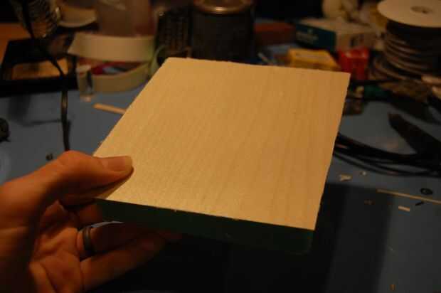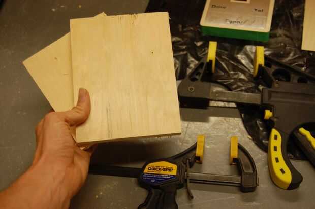 La última cosa que pegar por ahora es la chapa de madera. Empezar por preparar dos pedazos planos de madera ligeramente más grande que el caso y las abrazaderas de dos o más. Cortar un trozo de chapa más grande que el caso sí mismo y fijar la chapa y la caja de lado a lado. Usé pegamento aerosol fuerte que les pegan. Rocíe la parte superior de la caja y la chapa, esperar un minuto o dos, luego les pegan. Inmediatamente sujetarlos con las piezas planas de madera en la parte superior e inferior de la caja. Dejar secar durante unas horas.