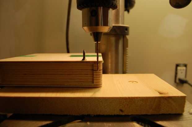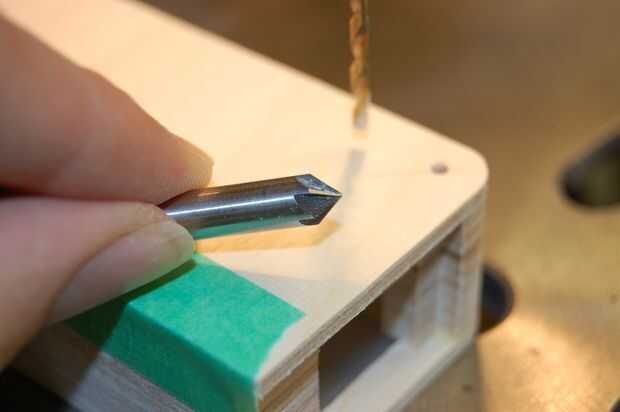 Cinta de la placa de fondo en la caja con cinta de enmascarar, consiguiendo la alineación tan cerca como sea posible. Observe el tamaño de los tornillos que va a utilizar y elegir una broca de taladro para que coincida con, utilicé un 7/64" bits. Taladre un orificio guía en cada una de las cuatro esquinas. Luego, añada un avellanado a cada uno de los agujeros con una broca de avellanar.