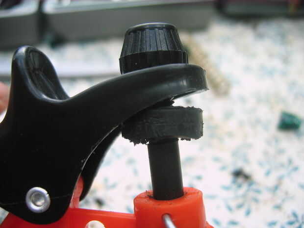 Ahora cuando la manija hacia abajo, empuja en este pedacito de goma y el eje va como se esperaba.