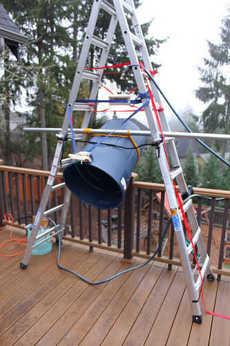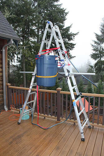 Es un bote de basura de 33 galones atacó a un pedazo de post de enlace de cadena que se celebra en mi escalera. Cuando la lata esté en posición vertical se sostiene en que posición con un imán de puerta electromagnética que puede ser operado remotamente con el wireless conectado utiliza la válvula de la manguera instructable. Así que a punta de lo vertical, encender el imán, llenarlo con agua y luego esperar. Esto es lo que sucede.
