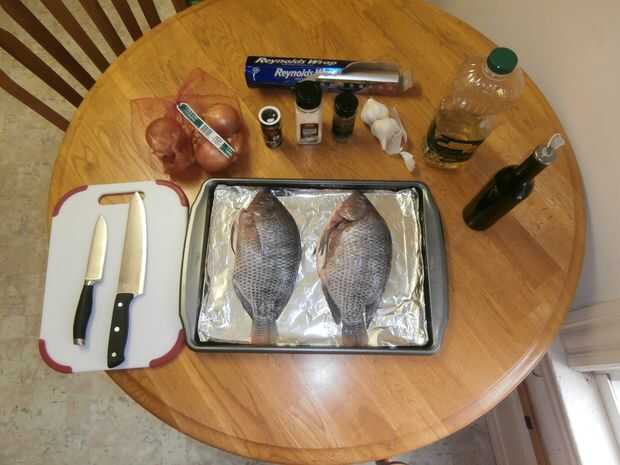 -Dos fresco, eviscerado y limpieza tilapia (puede utilizar cualquier pescado te gusta, sólo ajustar la temperatura del horno o tiempo en el horno en relación con el peso de los peces para evitar sobre o bajo de cocina) también, no tienes que cocinar dos peces. Uno suele ser suficiente. :]