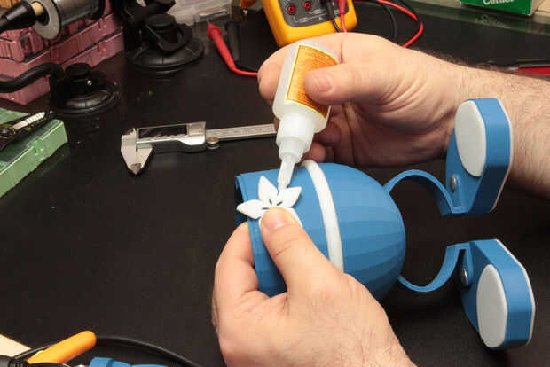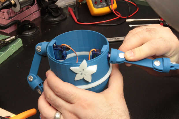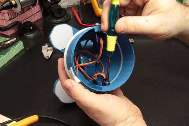¿Recuerdas cómo nos pegan el cuerno del servo para el conector del brazo? Aquí es lo mismo con la cabeza. Cuando tengas esto hecho, añadir los servos... debe encajar en su lugar; necesitarás tres. Dos para el torso y uno para el cabeza y el cuello.