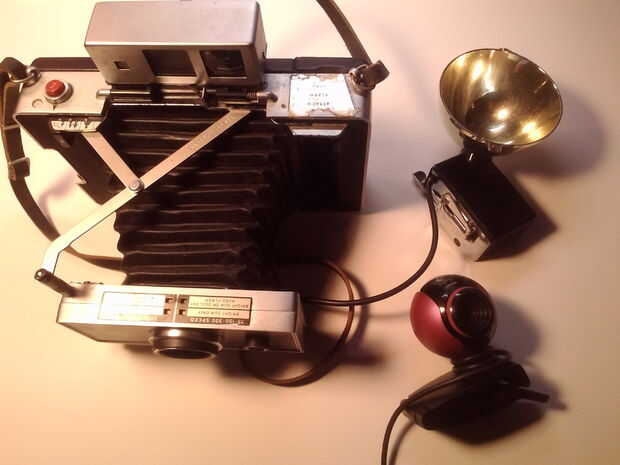 Cuando vi el concurso Vintage sabía que tenía que idear algo frío así que me fui a la sala de basura, err, 'Zona de inspiración'. Me encontré con una vieja cámara web de Logitech. Yo he estado esperando engancharlo en un lugar permanente en mi banco de trabajo para lapsos de tiempo de registro de estructuras, así que decidí mod lo en algo fresco y retro para el concurso. Entonces me acordé de la vieja cámara de tierra y todo lo que hizo clic. Quisiera poner el ensamble de sensor y lente desde la web cam en la cámara de tierra y alambre algunos LEDs en el flash como luz de video.
