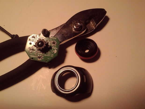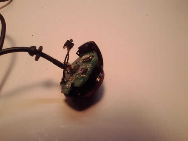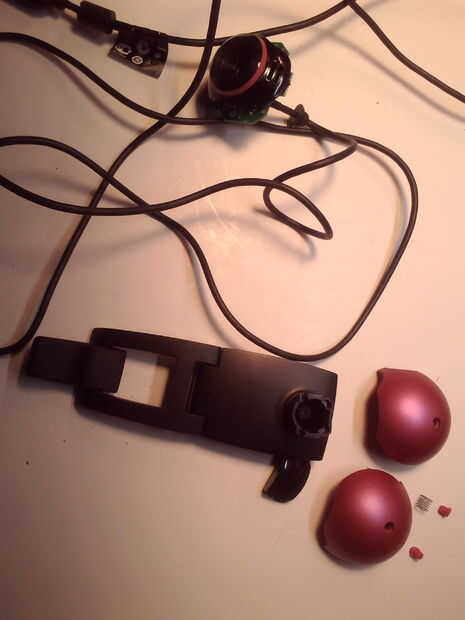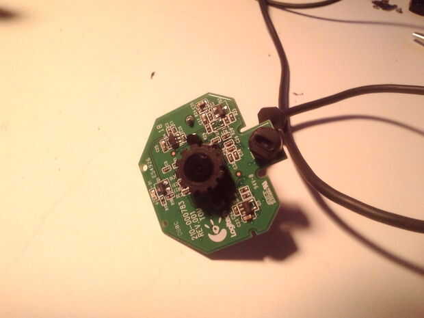 Desmontaje de la web cam es bastante recto adelante quitar algunos tapones de goma, quitar un tornillo, pop aparte y listo. Saque la placa con el sensor y el micrófono del soporte y montaje del anillo de enfoque. Esto es lo que necesitamos.