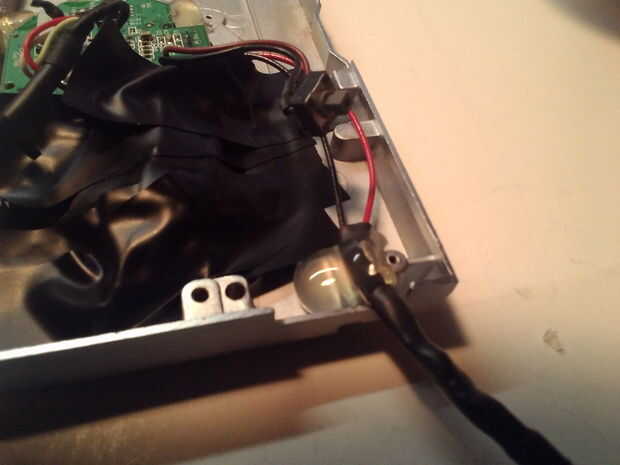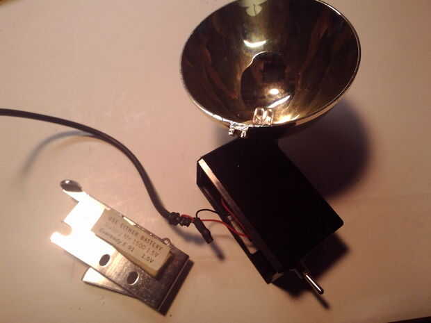 La unidad de flash bombilla fue despojada y dos LED azules fueron instalada con un interruptor y cables de corriente y tierra va a la caja de la persiana.