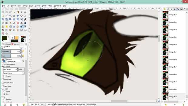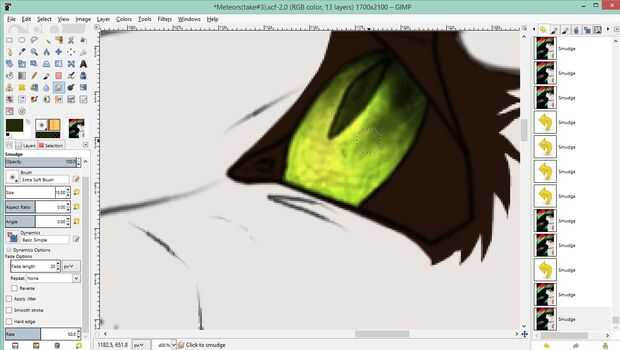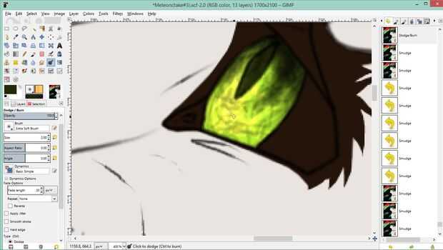 Hacer una nueva capa y en ella, el color en el ojo. Utilice la herramienta de Sobreexponer o subexponer con un cepillo suave de alto espacio para oscurecer la parte superior del ojo y aligera la parte inferior. Luego utilice un cepillo pequeño y suave en un espacio bajo para agregar líneas onduladas alrededor del ojo para el detalle. Usando movimientos circulares, difuminar un poco el ojo. Color en la parte blanca del ojo y rasgar los conductos.