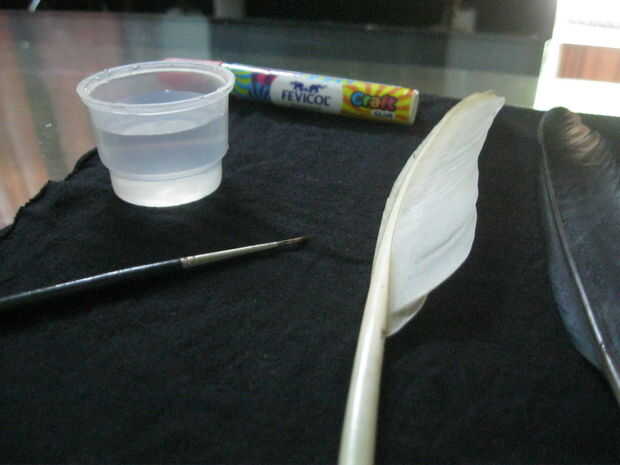 Para utilizar las plumas como la lona, es más fácil si la paleta está un poco duro o rígido que puede mover fácilmente las escobillas sin rasgado para arriba. Así que una solución diluida de agua y fevicol (o cualquier otro pegamento que sea transparente en la sequedad)
