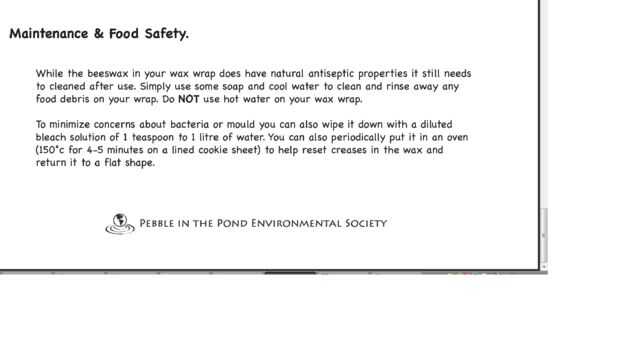 Su envoltura de cera debe durar en promedio un par de años. Para asegurar que siga siendo alimento-segura, necesitas enjuagarlo y usar una lejía débil o solución del peróxido de vez en cuando. Inspeccione el paño de cera cada vez que utilice para asegurarse de que no hay ninguna descoloración (o molde), y usted puede también colocarlo en el horno a 150 grados C. durante 4-5 minutos cada vez en cuando se reinicia la cera y desinfectar la envoltura de cera. También puede utilizar una plancha para volver a aplanar su envoltura de cera para hacer nuevas formas, agregar más cera, etc..