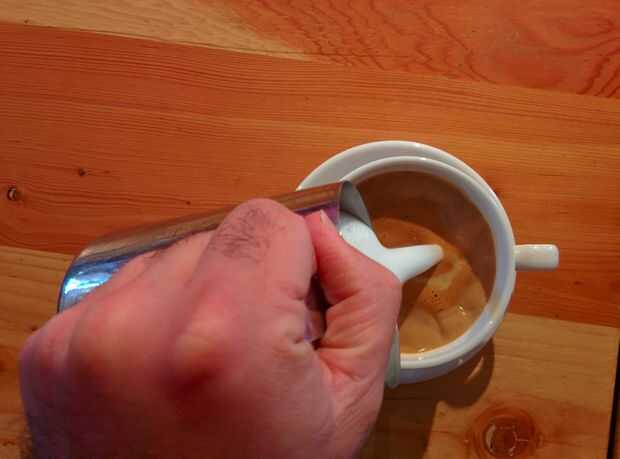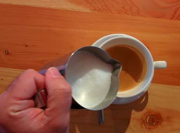 Vierta el espresso recién hecho en la Copa y luego añadir cuidadosamente la leche.