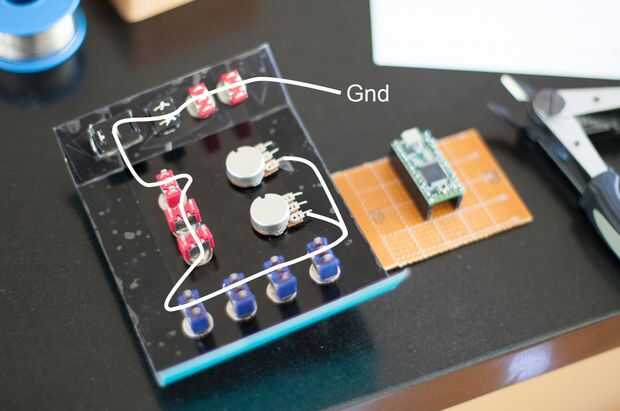 También es un buen momento para pegar en los LEDs, si usted está utilizando y soldar el pin negativo sobre el mismo cable de tierra que se utilizó para los botones. (Estilo ronda los LEDs tienen un lugar plano que marque el lado negativo)