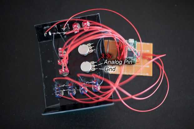 No importa qué lado obtiene con cable a 3.3v y que a la tierra, pero el perno medio debe ir a una entrada en el Teensy analógica (marcado en color naranja en el diagrama del último paso).