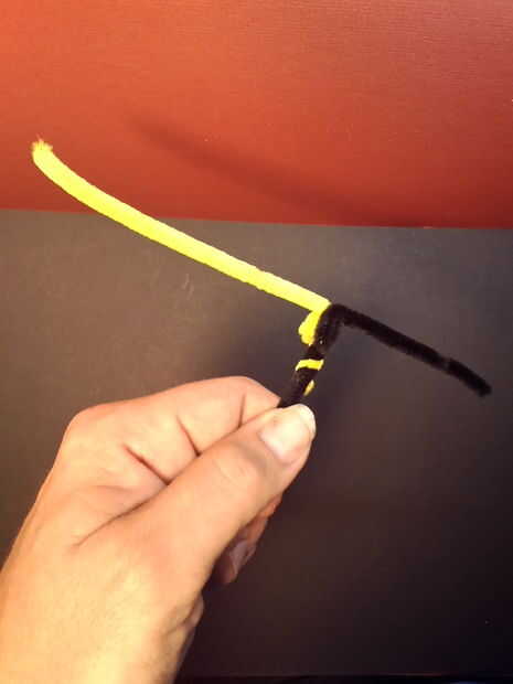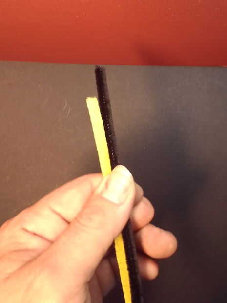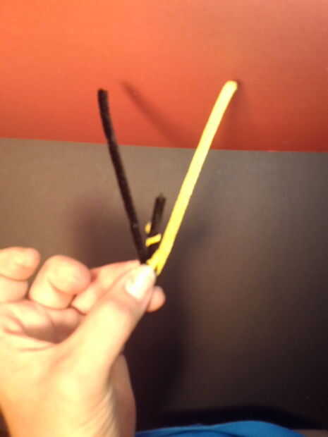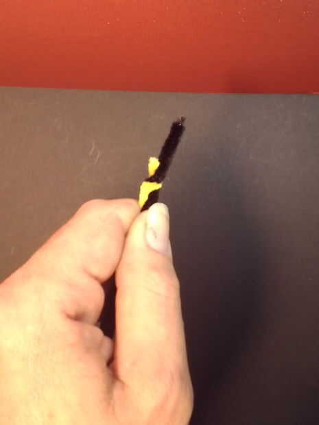 1. recoger tus pedazos de limpiapipas. Sosténgalos junto con uno pegarse más allá de la otra aproximadamente 1/4-1/2 pulgadas, dependiendo del tamaño de su grano. Esto formará el cuello de las abejas y el cabello, así que si quieres una abeja rubia hacer el limpiapipas amarillo que pega hacia fuera más lejos.