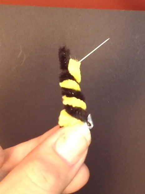 7. ahora vamos a añadir el pasador de seguridad. Primero abra que pin y endereza hacia fuera lugar a lo largo de la parte posterior del cuerpo y envolver los limpiapipas en el resto del cuerpo y el perno de seguridad, sujetarlo firmemente. Al llegar a la parte superior del cuerpo donde el cuello sale recortar los limpiapipas restantes lo suficientemente cortos como para que puede empujarlos dentro del cabeza del grano sin pegarse al otro lado. Cuidado de no obtener picada por el pasador abierto de abeja!
