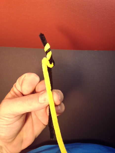 6. ahora comenzaremos a enrollar suavemente los dos limpiapipas alrededor del cuerpo. Que el bombeo hacia el frente y hacer una envoltura en la parte delantera del cuerpo. Tenga cuidado de hacer los limpiapipas cruzar el frente del cuerpo horizontalmente para formar rayas de la abeja.