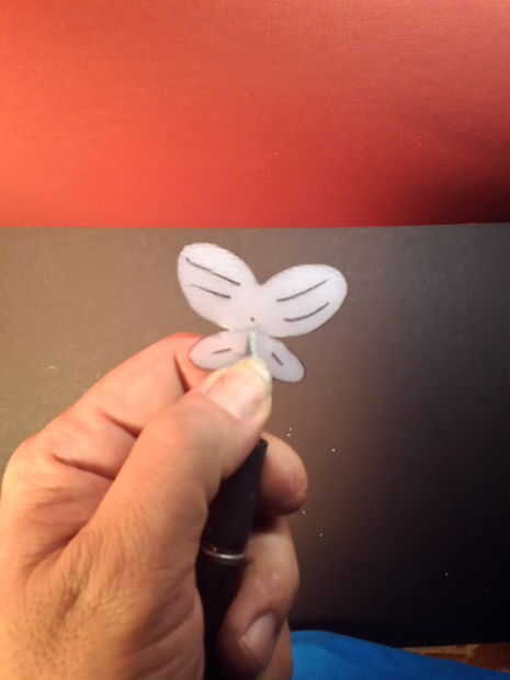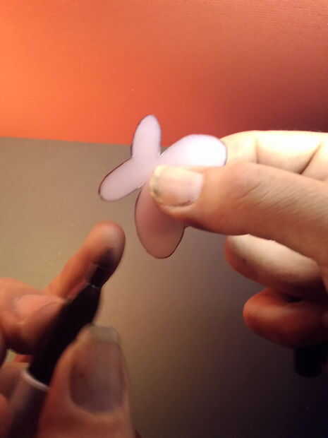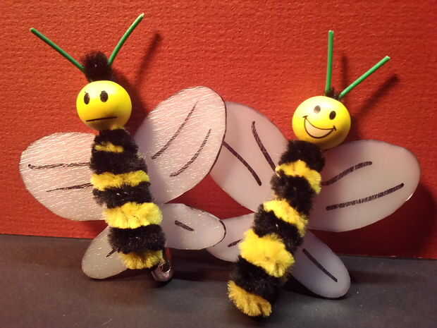 Ahora tomamos nuestro scrap de plástico para hacer unas alas. Dependiendo del grosor de su plástico puede utilizar tijeras o un cuchillo de la manía para cortar hacia fuera. Cuidado de cualquier manera - no Haz picado de abeja! Puede copiar mis alas o diseñar su propio. Fui alrededor del borde de las alas y agregó algunos detalles con un rotulador.