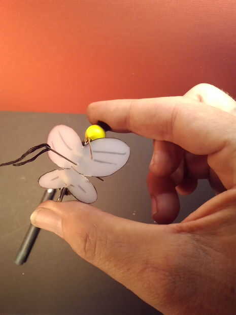 Cuando todo sea de su agrado puede agregar algunas antenas. Cortar un par de pedazos cortos de alambre de longitud suficiente para entrar en el agujero en la parte superior de la cuenta de cabeza de las abejas. Utilice un pequeño de pegamento en la punta del cable antes de insertarlo para sostener todo junto. Esto debería completar su pin.