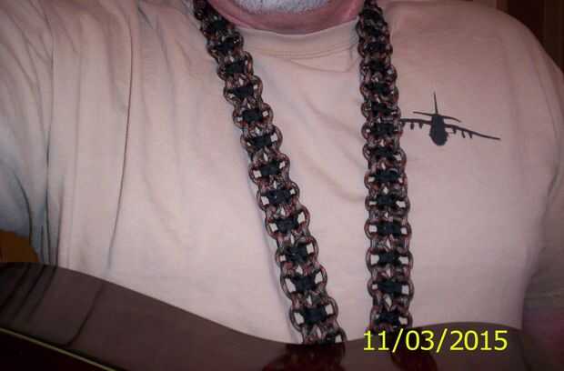 Me gusta mucho la correa. Tiene un poco de primavera, que hace que sea más cómodo llevar mi doce cuerdas de acero (relativamente pesado). Es ajustable, así que puedo mover entre guitarras si quiero. No, cuz ya hice una correa para mi nylon seis cuerdas (usando una trenza plana de cinco cuerdas, una continuación posible ' ible), y los colores de éste no son adecuados para mi bajo acústico (otro proyecto!). También utilicé este patrón para hacer un cabestrillo del hombro no ajustable para mi ballesta (fotos al final) que funciona muy bien debido a la acción elástica. Un proyecto de futuro será averiguar cómo hacer un cabestrillo ajustable rifle usa este patrón...