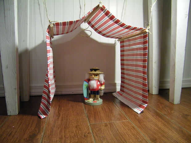Hilo atado a cada tornillo de ojo y cubierto sobre la mesa. La tela fue cubierta sobre las varillas y ajusta entonces hasta que fue convenientemente tienda-como. La espiga del centro debe colgar más arriba de los lados. Los lados deben ser aproximadamente la misma altura.