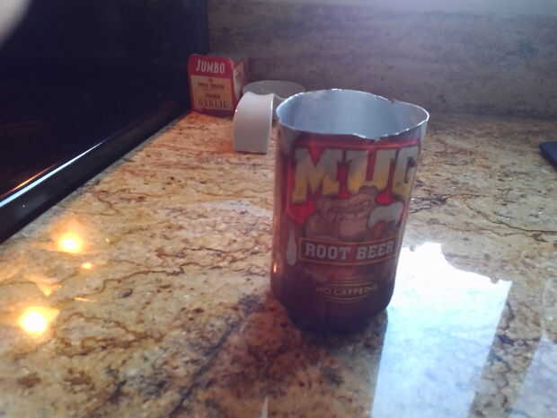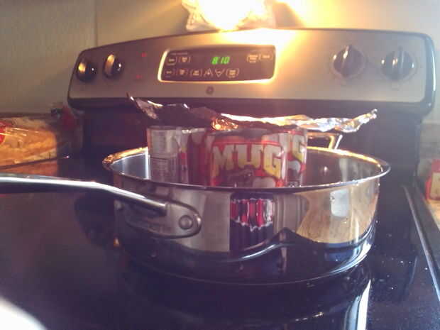 Cortan la parte superior de unas latas de refresco y coloca el corte encima de trozos de cera en ellos. Coloqué en una cacerola poco profunda llena de agua y lo trajo a fuego lento. Coloqué un pedazo doblado de papel de aluminio encima de las latas para conservar el calor como la cera derretida.