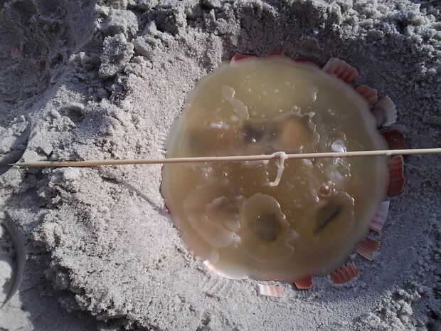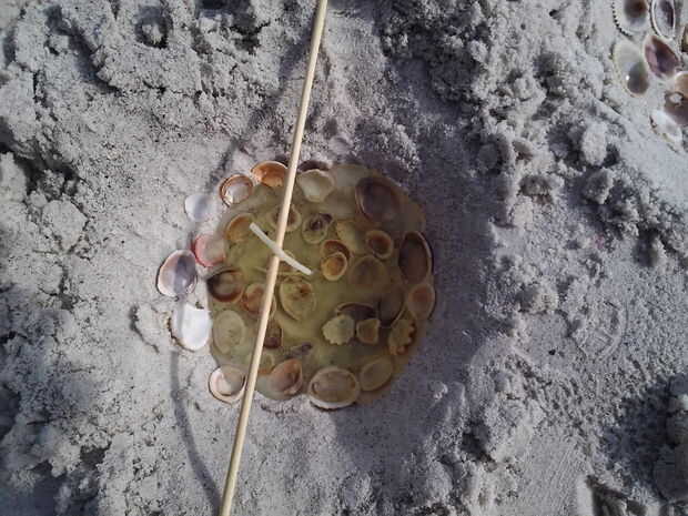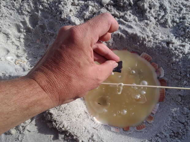 Cuando la mecha está en su lugar poco a poco Vierta la cera en su agujero. Si la arena es muy fina puede colocar una concha en la parte inferior de su agujero para verter la cera sobre por lo que la presión de la cera no desordenar el agujero. Cuando se llenan todos sus agujeros puede dejarlos enfriar o puede caer cáscaras enteras o trozos de coral en la cera para que estén al descubierto como la vela se quema.