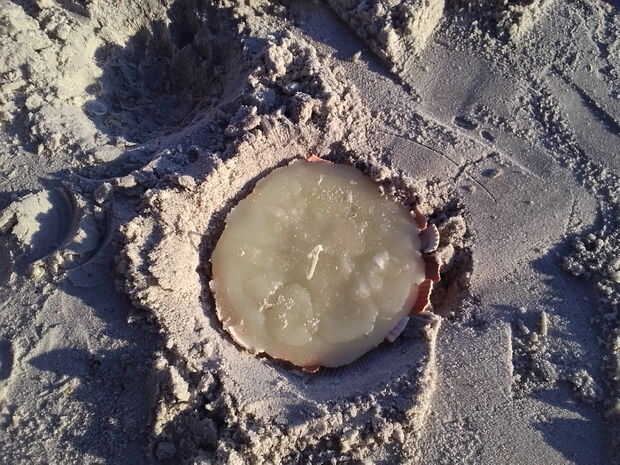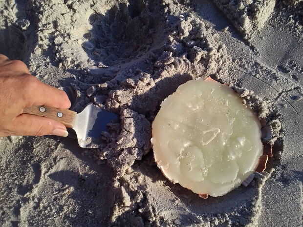 Cuando la cera es totalmente enfriado y sólido con cuidado se puede quitar de la arena. Cepille con cuidado la arena suelta y luego enjuague su vela. Da TA - hiciste una vela de playa!