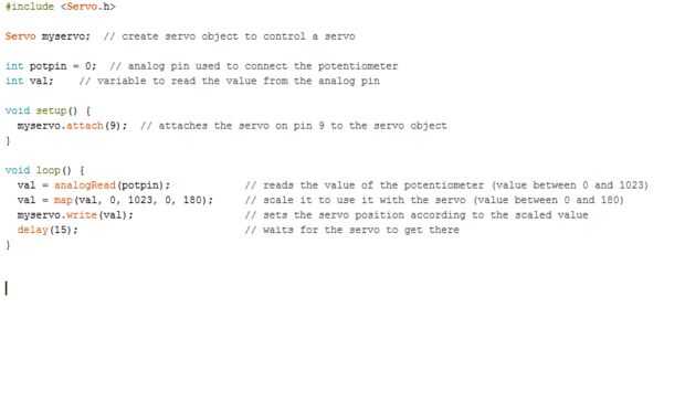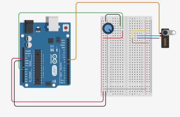 La foto muestra la arduino/placa básica para la combinación motor Servo y potenciómetro. Porque el motor del Servo tiene un cable triple más largo propio, puede poner un cable puente justo en el extremo de cada una de las tres ranuras en el cable de servo motor y caer en los mismos orificios como se muestra en la placa.
