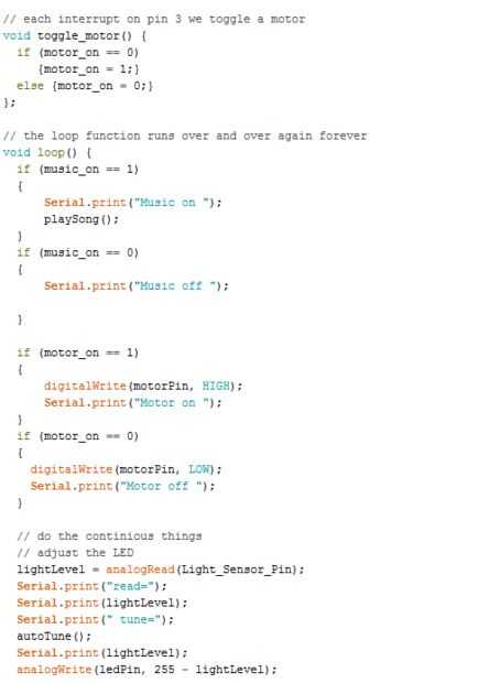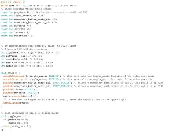 Gracias a una absolutamente increíble ayuda de Dan McCreary de CoderDojo en las ciudades gemelas, ahora tengo un boceto de arduino de función combinada que permite a todos los componentes trabajar simultáneamente a través de cuatro factores desencadenantes distintos!!!! Consiguiendo que averiguado era fuera del alcance de mi actuales conocimientos de lenguaje de programación "C", pero Dan, siendo el súper chico que es, estaba dispuesto a ayudarme hacia fuera. ¡ Gracias Dan!
