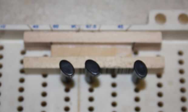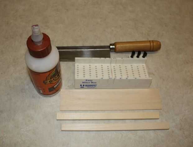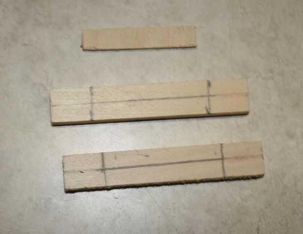 Comencé midiendo y marcando la longitud que quería las piezas exteriores, que en este caso fue 3" y 1 ½" para el pedazo de centro (medida dos veces, corte una vez). Había asegurado los pedazos uno a la vez en la caja de ingletes y corte a la longitud. Después de cortar las piezas he utilizado una tri-Plaza, cinta métrica y lápiz (no se muestra) para que mida y marque la línea central y el punto medio de ambas piezas del exteriores.
