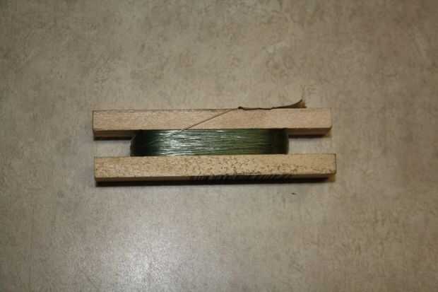 Utiliza Gorilla Wood Glue™ para unir las tres piezas y la caja de ingletes y pernos de fijación para mantenerlo todo junto hasta que totalmente seco (24 horas). Una vez que la pieza estaba seca usé extra fino (grano 400, creo) papel de lija para suavizar los bordes ásperos y luego enrollé alrededor de 150 pies de 12 libras de prueba Stren™ monofilamento en el artilugio con un pequeño trozo de cinta adhesiva para fijar el extremo.