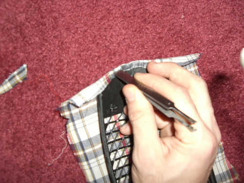 Comienza aplicando el pegamento, luego con la punta inclinada pinzas (o pinzas) tirón de la tela hacia arriba y sobre la parte con el pegamento. Luego utilice el extremo del otro par de pinzas y lo deslícelo a largo del punto es adherirse a. Hacer esto durante unos segundos.